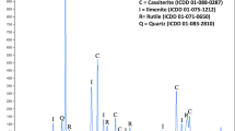 Figure 4 shows the surface morphology of the raw and chlorinated ores. The particle sizes of the raw ilmenite were not significantly different from those of the ilmenite selectively chlorinated for 40 min to remove FeO by mixing coke (comparison between Fig. 4a,b). However, the surface roughness of the synthetic rutile chlorinated for 30 min to produce TiCl4 (Fig. 4b) was significantly different from that of the raw natural rutile (Fig. 4d). Kim was investigated that microstructure changes in ilmenite occurring after selective chlorination. In other words, it was noted that the change in the size of the pores due to selective chloride reactions has a significant effect on the response efficiency for TiCl4 manufacturing. However, there was no pore comparison with natural rutile33. Sohn and Zhou also reported that the chlorination efficiency of the synthetic rutile selectively chlorinated from ilmenite ore was higher than that of natural rutile due to the influence of pores34. They, however, did not consider the application of the shrinking-core model, unlike Swanepoel32. They mentioned that this was because pore diffusion was partially generated by chemical reactions in the particles. The reaction efficiency of the synthetic rutile with higher porosity due to the removal of FeO (Fig. 4c) was higher than that of the natural rutile (Fig. 4e), and thus chlorination was accelerated for the synthetic rutile. This was consistent with the reaction results of Fig. 3 and the results of Sohn and Zhou (1999).
