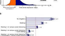 The estimated contact rate \(m^I\) within UIUC is \(4.85\approx 5\) with a range of [1, 11] and standard deviation of 1.35. The median contact rate from the estimates is 3. Similarly, the mean and median external contact rate \(m^E\) is 2. While \(m^I > m^E\), the proximity among these estimates indicate that the prevalence of infection in the county around the institution contributes heavily towards the infections within the institution. Recall that \(\beta ^I = \beta ^0 m^I\) denotes the internal infectivity rate. This rate is estimated at 0.12 with a standard deviation of 0.02. One often uses the basic reproduction number of an epidemic as a metric of how fast an epidemic is growing. This number is given by \(R^0 = \beta ^I/\gamma\), the ratio of the infection rate within the institution and the recovery rate. For UIUC, \(R^0\) is estimated to be 1.82 with a \(95\%\) confidence interval of 0.75–3.05 for an average recovery period of 15 days. Early published estimates put \(R^0\) for COVID-19 in the range 3.40–3.6716,33. Thus, our estimates for UIUC are significantly lower than published estimates. We suspect that the difference between these estimates emanates from the institutional setup that is significantly different than that of general social life. The differences arise in terms of the population sizes, the ability of institutions to enforce preventative measures such as social distancing, mask wearing and extensive facility sanitization.