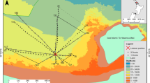 To simultaneously collect noise data, an underwater acoustic recorder (SNAP, Loggerhead Instruments Inc., Florida United States; sampling rate 44.1 kHz, 16 bit) provided with an omnidirectional HTI96-min hydrophone (High Tec, Inc., Mississippi United States; sensitivity − 170 dB re 1 V μPa−1, recording .wav files) was moored at the centre of the study area (hereafter referred to as “sound recorder”). The sound recorder was programmed to record 1 min every 11 min from June 22nd to August 8th. We used ten days of data (July 24th to August 3rd), when we obtained simultaneous data for the maximum number of tagged individuals (N = 8 individuals) and sound recordings. To automatically detect peaks of noise generated by motorboats passing at close range, we processed the data in MATLAB (version 2011b) using custom-written scripts following Merchant et al.45. Power spectral density (dB re 1 μPa2 Hz−1) was calculated in 1-s non-overlapping segments over the entire frequency range (i.e., 0–22 kHz) for the whole file. Following Merchant et al.45, we calculated the sound pressure level (SPL) as the mean squared sound pressure (p2rms) expressed in decibels, where pref is a reference pressure of 1 μPa.