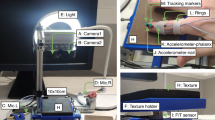 Sonification was generated in real time with Max software (http://cycling74.com). In the Neutral (control) condition, a pure sound was associated with the movement velocity. In the two textured (experimental) conditions, the synthetized friction sounds resulted from the action-object paradigm34,35. This paradigm describes the sound as the result of an action on an object and presumes the existence of sound invariants (i.e., perceptually relevant signal morphologies that carry information about the action’s and/or the object’s attributes). The notion of sound invariants was first adapted from vision to auditory perception by Warren and Verbrugge53 and formalized by McAdams and Bigand54 who split auditory sound invariants in two categories: Structural invariants responsible for the recognition of physical properties of a sounding object (its material, shape, etc.) and transformational invariants responsible for the recognition of the action on the object (breaking, rolling, etc.). Thanks to this categorical distinction, it is possible to recognize a bottle by the sound it produces, and whether it bounces or breaks. In the current study the two textured sounds were obtained from the evocation of two different actions, namely rubbing and squeaking. These actions were produced on the same object (a plastic surface) to determine if differences in the action attributes may affect the perceived roughness, with a squeaking sound evoking greater roughness than a rubbing sound. More details including the signal spectrum of the three sounds are provided in Supplementary information55 and a video is available with the electronic version of the manuscript.
