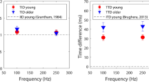 To further investigate to what extent textured sound distractors had a negative effect on haptic discrimination performance compared to the Neutral sound distractor, individual Gain indexes of the discrimination thresholds were computed for each textured sound condition (Fig. 2D). First, we compared the Gain indexes between the Sound and Group factors using a linear mixed-effects model (LMM). It revealed a significant main effect of Group (Chisq(1) = 6.14, p = 0.013) but no significant effect of Sound nor interaction between Sound and Group (Table 1B). The Gain indexes were found significantly lower in the older group than in the younger group. In addition, Student’s t-test used for the comparisons to zero showed that Gains indexes were significantly negative for the Squeaking and Rubbing sound conditions in the older group (GainSqueaking: − 23.50 ± 39.1, t(18) = − 2.62, p = 0.017; GainRubbing: − 23.01 ± 35.6, t(18) = − 2.82, p = 0.011). No significant differences were found in the younger group (GainSqueaking: 7.01 ± 34.6, t(19) = 0.90, p = 0.38; GainRubbing: − 2.95 ± 43.4, t(18) = − 0.29, p = 0.77) (Fig. 2D). This result reflected an impairment in haptic discrimination in presence of irrelevant textured sounds over the Neutral sound condition only in the older group.