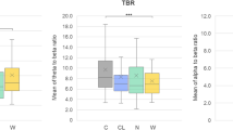 Measures for this study include theta and delta in 0–500 ms and 500–1000 ms time windows. Original signals were bandpass filtered separately for delta (0–3 Hz) and theta (3–7 Hz), the RID TF transform6 was then applied, and the activity indexed within the defined windows. Delta is often associated with deep sleep and mediation, while theta is associated with deep mediation, and is our gateway to learning, memory, and intution. In theta, our senses are withdrawn from the external world and focus on signals originating from within. High theta and delta activities indicate less mind wandering.
