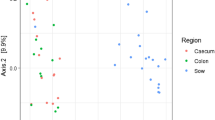 The statistical analysis of caecal microbiota was performed in open-source software R v3.5.3. (R Foundation for Statistical Computing, Vienna, Austria). Support for QIIME in R was achieved through the phyloseq package62. Alpha diversity analysis was performed using vegan63 and microbiome64 packages from raw counts (OTU level), including observed species, Chao1, Shannon and Simpson indices. For beta diversity, measurements were calculated using the Whittaker index65 and the betadisper function of the vegan package using relative abundances. To compare any differential effects an ANOVA analysis was performed for richness and alpha diversity. A non-metric multidimensional scaling (NMDS), an analysis of similarities (ANOSIM), a permutational analysis of variance (PERMANOVA) and unweighted pair group method with arithmetic mean (UPGMA) hierarchical clustering, all based on Bray–Curtis distance, were also performed for ordination and beta diversity analysis. Cumulative sum scaling (CSS)66 normalization of raw counts and differential abundance analysis were performed following the metagenomeSeq package pipeline67. Taxa were aggregated at phylum, family and genus level and expressed as compositional data. Relative abundances were used to plot taxon abundances. Statistical significance was assumed at P < 0.05. The parity number (primiparous/multiparous) was initially included in the different statistical approaches but did not show any significant impact on the data.