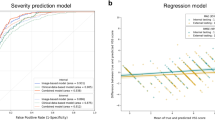 The output of the trained CNNs was four continuous numbers between 0 and 1 for each input image that could be interpreted as the probability of each severity level. For example, if an image \(\mathrm{X}\) was given to one of CNNs, the output was \({\widehat{y}}_{1}, {\widehat{y}}_{2}, {\widehat{y}}_{3}, \mathrm{and} {\widehat{y}}_{4}\), which were the probabilities of each severity score from 0, 1, 2, and 3, respectively. To identify misclassified severity scores, the specificity and sensitivity of each severity score were analyzed over a change in threshold from 0.01 to 1.00 and their receiver operating characteristic (ROC) curves were plotted using the following equations:
