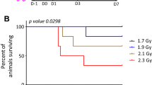 Seven-week-old, male, C57BL/6J mice received TBI with 0, 1, 3, and 5 Gy, and survival analysis was performed using the Kaplan–Meier method (Supplementary Fig. S1a). The median survivals in the 0-, 1-, 3-, and 5-Gy groups were 836.5 (95% confidence interval (CI) 880–804), 846 (95% CI 883–709), 659 (95% CI 520–743), and 609 (95% CI 531–734) days, respectively. The log-rank test was used to analyze the significance of differences in overall survival. The 1-Gy group did not show a shortened life span compared with the 0-Gy group (Supplementary Fig. S1b). The 3- and 5-Gy groups had significantly shorter survival than the 0-Gy group (Supplementary Fig. S1c,d).