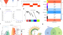 WGCNA is a widely used systems biology method that is able to transform gene expression data profiles into a scale-free network9. Outlier samples were excluded to maintain the reliability of network construction results. The appropriate soft threshold power (soft power = 14) was chosen with reference standard scale-free networks, with the power function used to calculate adjacency values between all differentially expressed genes. A topological overlap matrix (TOM) was then formulated based on the adjacency values in order to calculate the corresponding dissimilarity (1-TOM) values. Module identification was accomplished with the dynamic tree cut method by hierarchically clustering genes using 1-TOM as the distance measure with a minimum size cutoff of 30 and a deep split value of 2 for the resulting dendrogram. A module preservation function was used to verify the stability of the identified modules by calculating module preservation and quality statistics in the WGCNA package14.