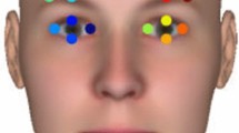 Participants performed a two-interval forced choice discrimination task (Fig. 1b). This task was identical to the control condition of Experiment 1 except the two test faces were presented to the same side of the visual field either to the left or right of fixation. The location of the faces alternated over trials. Again, the eyebrows and mouths oscillated sinusoidally at 1.5 Hz, raising and lowering in the case of the eyebrows and opening and closing, in the case of the mouths. The participants’ task was to report, by a keypress, which interval contained a face with a temporal misalignment of 12.5° of phase in its eyebrows. There were four global phase conditions randomly interleaved. The mouths were offset relative to the eyebrows by 0°, 90°, 180° or 270°. Both faces were presented either upright or inverted in randomised blocks. Participants completed a total of 640 trials over 20 blocks, providing 40 trials per feature relative timing per visual field per orientation. Eye tracking was again employed to enforce fixation during test face presentation.