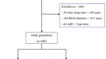 No difference was observed in the AHI between the REM non-rebound and REM rebound groups during PAP treatment, suggesting that PAP treatment decreases respiratory events; however, differences were observed in the sleep architecture and clinical characteristics between the groups. These phenomena were similar between the SWS non-rebound and SWS rebound groups. According to the definition of REM rebound, compared with patients without REM rebound, patients with REM rebound were younger, had a higher BMI, severe ESS, more TST and SE, a short SL, a higher arousal index, less WASO, more N1 sleep, less REM sleep and SWS, and worse OSA (higher AHI and ODI, longer duration of apneas and hypopneas, and a lower baseline SpO2, SpO2 nadir, and degree of oxygen desaturation) in the diagnostic PSG study. These statistically significant differences were observed in most diagnostic PSG parameters that coincided with clinical symptoms. Compared with non-REM rebounders, REM rebounders experienced less dizziness, insomnia, anxiety, irritability, and depression. Similar to the present study, Koo et al.10 also found that patients with REM rebound tended to be younger, with a higher AHI and less REM sleep in the diagnostic portion than patients without REM rebound. In contrast to the present study, Koo et al.10 did not report t differences between the REM rebound and non-rebound groups in the degree of obesity, level of subjective sleepiness, or %SWS. Compared with patients without SWS rebound, patients with SWS rebound had more TST, higher SE, greater N2 and N3 sleep duration time, less N1%, less WASO, a higher arousal index, worse OSA (higher AHI, longer durations of apneas and hypopneas, lower mean oxygen saturation, substantial reduction in oxygen saturation during sleep, and a lower oxygen saturation nadir) in the diagnostic PSG study, a higher BMI and ESS, and were younger. Compared with patients without SWS rebound, patients with SWS rebound experienced less dizziness, insomnia, anxiety, and irritability. The cutoff values of 16% REM sleep in titration PSG and 6% changes in %REM were reasonable to define REM rebound and non-rebound according differences between the clinical and PSG characteristics. The SWS rebound cutoff value was also reasonable. Insomnia, anxiety, and depression can all lead to changes in sleep architecture16,17 and are common OSA comorbidities12,13,14,15. Thus, changes in the sleep architecture of patients with OSA are not caused by apnea and hypopnea events alone but also by comorbidities. The absence of REM and SWS rebound during the initial treatment of OSA with PAP may be explained by comorbid insomnia, anxiety, and depression. The initial PAP treatment can only decrease respiratory event-related arousal to restore REM sleep and SWS but has no effect on a longer sleep latency, increased WASO, decreased SWS, and REM sleep instability caused by insomnia, anxiety, or depression. Depression can increase REM sleep, explaining the greater incidence of depression in the REM non-rebound group, because patients with depression do not have a greater regulatory range of REM sleep5. Moreover, these patients may have increased sleep anxiety due to the use of PAP, resulting in a longer sleep latency, more WASO, and less SWS and REM sleep. The phenomena that patients with OSA but without REM rebound or SWS rebound reported more insomnia, anxiety and depression indicated that treatment of these comorbidities may possibly help restore the sleep architecture of patients with OSA through an initial pressure titration. This study is the first to explore the relationship among OSA comorbidities, REM and SWS rebound during initial pressure titration.