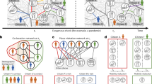 To produce this dataset, machine learning is applied to logs data to automatically segment it into semantic trips4. To provide strong privacy guarantees, all trips were anonymized and aggregated using a differentially private mechanism to aggregate the flows41. This research is done on the resulting heavily aggregated and differentially private data. No individual user data was ever manually inspected, only heavily aggregated flows of large populations were handled. As a result, the data is represented as a flow matrix \(\mathbf {T}\) whose elements \(T_{ij}\) correspond to annualized out-flows from location i to j for the year 2016. For the purposes of our analysis we consider the 50 largest cities in the United States and analogously in Brazil ranked according to their population. In Fig. 1, we show the resulting mobility network for the United States and Brazil, with New York and Rio shown as inset. The nodes correspond to cities, and the edges are weighted normalized flows between the various locations. The full list of cities along with their populations are shown in Supplementary Tables S1 and S2.