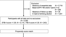 Numeric variables are expressed as means ± SD for parameters with normal distributions and as medians (interquartile ranges) for parameters with skewed distributions. The distribution of each parameter was tested for its normality using the Shapiro–Wilk W test. Comparisons between two groups for parametric and nonparametric parameters were performed by using Student’s t-test and the Mann–Whitney U test, respectively. Clinical parameters were divided into three subgroups according to tertiles of FLI at baseline (T1 ~ T3) in both male and female subjects. Intergroup differences in percentages of demographic parameters were examined by the chi-square test. One-way analysis of variance for parametric parameters and the Kruskal–Wallis test for nonparametric parameters were used for detecting significant differences in data between multiple groups. The association between FLI levels at baseline and the development of CKD was investigated by multivariable Cox proportional hazard models with a restricted cubic spline after adjustment of confounders including age, eGFR, hemoglobin, uric acid, smoking habit, alcohol drinking habit and diagnosis of hypertension, diabetes mellitus and dyslipidemia at baseline. In addition, HRs and 95% CIs for the development of CKD in tertiles of FLI level at baseline were calculated by adjustment of the confounders. To compare the discrimination of CKD development between the models adjusted for confounders as traditional risk factors for CKD with and without FLI level, C-statistics analogous to the area under the receiver operating characteristic curve were estimated using the method of DeLong et al.52. Moreover, the increased discriminatory value of FLI level was examined by the continuous net reclassification improvement and integrated discrimination improvement53. A p value of less than 0.05 was considered statistically significant. All data were analyzed by using EZR54 and R version 3.6.1.