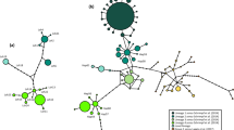 Genetic diversity was estimated by calculating the number of polymorphic (segregating) sites (S), the number of haplotypes, the haplotype diversity (Hd), the average number of nucleotide differences (k), and the nucleotide diversity (π) utilizing the program DNAsp v.5.10.0185. Mutational changes between sequences in the most parsimonious haplotype network were estimated using TCS v.1.2186, and the genealogical relationships were visualized with PopArt v1.7.287.