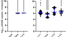 Screening for Wolbachia in Ae. aegypti samples was undertaken by qPCR. Briefly, individual DNA was extracted by homogenizing head/thorax body parts in Squash Buffer (10 mM Tris–Cl, 1 mM EDTA, 25 mM NaCl, pH 8.2) supplemented with Proteinase K (200 ug/ml) and incubating at 56 °C for 5 min. Extraction ended by enzyme inactivation at 98 °C for 15 min. DNA amplifications were carried out with FastStart Essential DNA Probes Master (Roche), using specific primers and probes to Wolbachia pipientis WD0513 and Ae. aegypti rps17 markers (Supplementary Table S3). Thermocycling conditions were set on a LightCycler 96 Instrument (Roche), as follows: 95 °C for 10 min (initial denaturation), and 40 cycles of 95 °C for 15 s and 60 °C for 30 s. Samples were analyzed using absolute quantification, by comparison to serial dilutions of either gene product, cloned and amplified in the pGEMT-Easy plasmid (Promega). Negative control samples were normalized between plates, and were used as reference to determine a minimum threshold for positive samples.