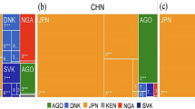This summation rule allows us to regard the coarse-grained entropy of Eq. (12) as inter-sectorial and \(\Delta H_c\) in Eq. (14) as intra-sectorial contributions to the total entropic measure of country c. As we see in Fig. 6a, the intra-sectorial contribution is more substantial for countries with high entropic measure, indicating the importance of organization within sectors. In Fig. 6b, we report also the total export of each country as a function of \(\Delta H_c\). One sees that the countries with the largest export, both in terms of total amount, and in terms of number of products, are those with highest intra-sectorial contribution. Germany (DEU) reaches the top of the list in this case. At the same time, most of the countries belonging to the “poverty trap” show a low \(\Delta H_c\), which is another indication of the scarce inner organization of their economic structure.