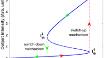 The first set of analyses examined the role of nested interaction in OB when the coupling fields \(E_{2}\) and \(E_{5}\) are both strong enough to lead the three-photon dressed effect. Figure 6(a1) shows that there are three split OB intensity peaks for satisfying the enhancement conditions \(\Delta_{1} + \lambda_{1 + } + \lambda_{1 + \pm } = 0\) and \(\Delta_{1} + \lambda_{{1{ - }}} = 0\), where the eigenvalues are \(\lambda_{{{1 + } \pm }} = (\Delta_{{2}} + \lambda_{{{2} \pm }} - \lambda_{{1 + }} {)/2} \pm \sqrt {(\Delta_{2} + \lambda_{{{2} \pm }} - \lambda_{{1 + }} {)}^{2} {/4 + }\left| {G_{2} } \right|^{2} }\) and \(\lambda_{2 \pm } = \Delta_{5} /2 \pm \sqrt {\Delta_{5}^{2} /2 + \left| {G_{5} } \right|^{2} }\). Figure 6(b1) reveals a positive correlation between output intensity and input intensity as well as a slight increase bend of output curves when \(I{}_{i}\) increases from 100 to 200 and to 500. The inclined curves origin from the feedback effect of both three-photon dressed effects and cavity field \(g^{2} N\). As \(\Delta_{1}\) increases, the fast growth of right threshold of OB obtained in Fig. 6(c1). Figure 6(d1) demonstrates the enlarging OB scope with increased \(\left| {\Delta_{1} } \right|\), where the right thresholds sharply increase with slight growth in the left threshold. Besides, we observed that there are two points of no OB behavior at or close to the points \(\Delta_{1} = 0\,{\text{MHz}}\) and \(\Delta_{1} /\Gamma_{20} = { - }20\), for obeying dark resonance conditions \(\Delta_{1} + \Delta_{2} + \lambda_{2 + } = 0\) and \(\Delta_{1} + \Delta_{2} + \lambda_{{2{ - }}} = 0\), respectively. The phenomenon of no OB resulted from the disappearance of dispersion effect induced by the nested three-photon interaction. In short, the OB behavior of three peaks and two points of no OB behavior distributed asymmetrically at the center of \(\Delta_{1} = 0\,{\text{MHz}}\) under the nested interaction.