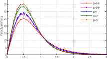 where \(\lambda \left( { = \tfrac{Gr}{{Re^{2} }}} \right)\) shows the mixed convection parameter, \(Re\left( { = \tfrac{{L^{2} \Omega \sin \alpha^{ * } }}{\nu }} \right)\) the Reynold number, \(Gr\left( { = \tfrac{{g\beta_{t} \cos \alpha^{ * } \left( {T_{0} - T_{\infty } } \right)\,L^{3} }}{{\nu^{2} }}} \right)\) the Grashoff number, \(N\left( { = \tfrac{{\beta_{c} \left( {C_{0} - C_{\infty } } \right)}}{{\beta_{t} \left( {T_{0} - T_{\infty } } \right)}}} \right)\) the buoyancy ratio variable, \(Ec\left( { = \tfrac{{\Omega^{2} Lx\sin^{2} \alpha^{ * } }}{{c_{p} \left( {T_{0} - T_{\infty } } \right)}}} \right)\) the Eckert number, \(\Pr \left( { = \tfrac{{\nu_{0} }}{\alpha }} \right)\) the Prandtl number, \(\beta \left( { = \tfrac{{Q_{0} }}{{\left( {\rho c_{p} } \right)\,\Omega \sin \alpha^{ * } }}} \right)\) the heat generation variable, \(\gamma \left( { = \tfrac{{k_{r} }}{{\Omega \sin \alpha^{ * } }}} \right)\) the chemical reaction variable and \(Sc\left( { = \tfrac{{\nu_{0} }}{D}} \right)\) the Schmidt number.