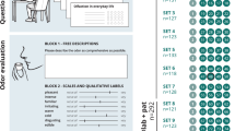 Experiments in a panel of 10 experienced subjects, trained before the actual experiments, ascertained that the odors presented during the main experiment were of similar intensity. For this purpose, odorous substances were diluted in propylene glycol if necessary (vol/vol concentrations in the liquid phase). Subsequently, the odors were presented using the specially designed computer-controlled olfactometer34, at a total flow rate of 2 l/min (Table 1). Four sets of 10 stimuli each were used, ensuring that each participant was randomly tested with a single set (Supplementary Fig. S1). Each odorant was presented birhinally through a flexible polyurethane tube that reached about 1 cm into the nasal cavity to release odors beyond the nasal valve. An additional nasal cannula (AirLife™, tube with 2.8 mm inner diameter) was used to monitor breathing (AWM2100V, Honeywell, MN, USA), so that olfactory stimuli of 5 s duration were emitted at the beginning of an inspiration phase. The order of the odorants was random. Each odor was presented in three repetitions at an interval of 40–60 s. The sequence of odor presentations was also randomized for each of the three blocks of presentations.