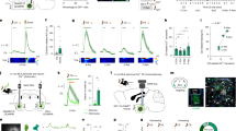 A total of 204 high signal-to-noise units in the BAL were stably recorded throughout the behavioral training, which were verified using principal component and correlation analyses (Fig. 1d–f), and was included in the data analysis. Histological analysis confirmed that these units had been recorded via electrodes with tips located in the BAL (Fig. 1g). 56% of recorded neurons (114 neurons) responded to the CS significantly in at least one of the training sessions (The Wilcoxon rank-sum test, p < 0.05). Among them, one group of BAL neurons exhibited excitatory responses to the CS as compared with their baseline firing rates during a period preceding the presentation of the CS (84 neurons, 74% of CS-responsive neurons; Fig. 2a, c), whereas the other group exhibited inhibitory responses to the CS as compared with their baseline firing rates (30 neurons, 26% of CS-responsive neurons; Fig. 2b, d). The average spontaneous firing rate was 1.178 ± 0.1336 Hz for CS-excited neurons and 1.252 ± 0.1622 Hz for CS-inhibited neurons (Fig. 2e). The average onset latency, which was calculated as the interval from the CS-onset to the appearance of the first significant response, was 43.87 ± 2.280 ms for CS-excited neurons and 58.00 ± 3.566 ms for CS-inhibited neurons (p = 0.0276 for Post-EX3, Mann–Whitney test) (Fig. 2f). The low spontaneous firing rates with short latencies to auditory CS were consistent with the findings of previous studies21,24,25,26,27. In addition, the proportion of CS-responsive neurons (CS-excited or CS-inhibited neurons) varied between sessions (Fig. 2g).