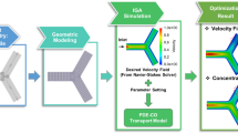 Since the pipe and the bifurcation have different geometry topologies, we train two separate simulators to handle different graph structures extracted from the simulation results. Both simulators share the same recurrent “GN block + MLP Decoder” architecture but are trained with pipe and bifurcation datasets, respectively. As shown in Fig. 2, the input feature vectors depicting geometry, parameter settings, boundary conditions and concentration values \(c^{t_{k}}\) at \(t_k\) are first processed by a series of GN blocks to learn the hidden layer representations that encode both local graph structure and features of nodes. In our GNN simulator, the GN block includes two modules \(\phi _e\), \(\phi _v\) to update the edge and node features, respectively. \(\phi _e\) computes the concentration gradient along the edge and the length of the edge. Given the spatial coordinates \(\varvec{p}_i\), \(\varvec{p}_j\) and concentration \(c_i\), \(c_j\) of two end nodes on edge \(e_{ij}\), \(\phi _e\) outputs the edge attributes \(\varvec{x}_{e_{ij}}\) as \(\left[ (c_j-c_i)/||\varvec{p}_j-\varvec{p}_i||, ||\varvec{p}_j-\varvec{p}_i||\right]\). \(\phi _v\) is a multilayer perceptron (MLP) consisting of two hidden layers (with ReLU activations), each layer with the size of 32. The forward computation of our GN block is characterized by Algorithm 1. After the GN blocks output the latent graph that encodes all the node features, a MLP is then used to decode the hidden layer representation and output predicted concentration values \(c^{t_{k+1}}\) at the next time step \(t_{k+1}\). The MLP has three hidden layers (with ReLU activations), followed by a non-activated output layer, each layer with the size of 32.