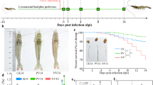 To prepare the feed and infection stimulus, each piece of shrimp muscle (0.5 g approximately) was cleaned with sterile water and placed into a 20-ml cell suspension of V. parahaemolyticus strain 64 (104 or 106 cells ml−1) for 30 min before use.