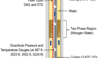 Two-phase flow experiments using water and nitrogen gas were conducted in the test-well to understand gas–water flow dynamics at well-scale conditions. The wellbore was initially filled with water in both the tubing and the casing, and a fixed volume of nitrogen gas (measured in barrels or bbl) was injected either down the tubing or the 0.5 in diameter gas injection line strapped to the tubing (as shown in Fig. 2b). The objective of the experiments was to observe and characterize the gas rise in water using the fiber-optic sensors and downhole gauges as described in detail in the references32,33.