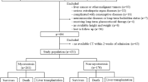 In the multivariate Cox analysis, liver cirrhosis (hazard ratio (HR) 2.758, 95%CI 1.323–5.750), serum bilirubin (HR 1.049, 95%CI 1.026–1.073), and INR (HR 1.725, 95%CI 1.263–2.355) were independently associated with mortality (P < 0.05) (Table 3), whereas L3-SMI and sarcopenia were not.