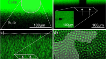Soft PEG microgels with a diameter of approx. 27 \({\upmu }\)m are fabricated by microfluidic emulsion polymerization and are filtrated inside a microfluidic PDMS filtration channel using a porous filter structure. The filter structure in the channel consists of several filtration blocks with a trapezoidal cross-section as indicated in Fig. 1b–d. The gaps between the filtration blocks are 3 \({\upmu }\)m such that the microgels are entirely rejected and do not permeate by deformation. The channel’s height is 150 \({\upmu }\)m, such that more than eight microgel layers fit in the filter cake on top of each other. A detailed geometrical description can be found in the method section and as a 3D stl-model in the supplementary information (SI1_ChannelGeometry.stl).