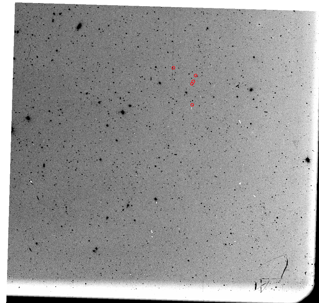 Another possibility are fragmenting asteroids. However, the field is far away from the ecliptic. Could the fragmentation of an asteroid sufficiently far from Earth result in a fragmented shower? Let us, for example, consider an asteroid at the main belt at \(\sim \) 1.5 AU from the Earth and 2.5 AU from the Sun. The Earths motion (\(\sim \)29.9 km/s) dominates over the motion of asteroids. During this time, the fragments must have moved at least \(50 *60 *29.9\) kilometers during the 50 minutes of exposure, resulting in 82 arcseconds long streaks in the image. At a distance of 30 AU (Kuiper belt), the displacement of fragments on the image is around 4 arcsec. At a distance on 0.1 AU from Earth and 1 AU from the Sun, the fragments would have moved roughly 20 arc minutes accross the field. Given the constant illumination of the Sun, long streaks are expected due to the orbital motion. Also, had a fragmentation occured, we’d see a parent body in the blue exposure taken 30 minutes earlier. We see no traces of a parent body in the previous blue exposure, taken half an hour earlier.
