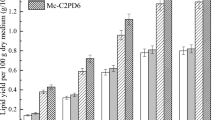 100 µL spore suspension (approx. 107 spores/mL) of the recombinant strain Mc-MT-2 was cultivated in 150 mL of K&R medium held in 1 L flask with shaking at 150 rpm for 24 h at 30 °C, and then used at 10% (v/v) to inoculated in a 3 L fermenter (BioFlo 110, New Brunswick Scientific Co., Ltd). Fermenter was controlled at 30 °C with stirring at 500 rpm and aeration at 0.5 v/v min−1 for 144 h. The pH was maintained at 6.0 by auto-addition of 4 mol/L NaOH or 2 mol/L HCl. It should be noted that supplemental metabolite control strategy depends on the experimental design. At certain time intervals, samples were collected and analyzed for dry cell weight (DCW) and lipid contents. All experiments were carried out in triplicate.