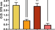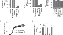 Most sub-inhibitory concentrations of antimicrobials had no significant inhibiting effects on total biomass and polysaccharides (see Fig. 2). Ciprofloxacin had a stimulating effect on biomass at low doses (\({\raise0.7ex\hbox{$1$} \!\mathord{\left/ {\vphantom {1 8}}\right.\kern-\nulldelimiterspace} \!\lower0.7ex\hbox{$8$}}\) and \({\raise0.7ex\hbox{$1$} \!\mathord{\left/ {\vphantom {1 4}}\right.\kern-\nulldelimiterspace} \!\lower0.7ex\hbox{$4$}}\) MBIC) in both S. aureus Newman strains. Total MN activity of the biofilms was inhibited up to 80% by doxycycline, erythromycin and resveratrol at concentrations below the MBIC (See Fig. 2). At high concentrations (± 100 μg/mL) resveratrol gradually precipitated, binding crystal violet and causing a strong false positive signal. Precipitated resveratrol, however, had no effect on the quantification of MN activity and polysaccharides (data not shown).