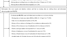 Although ultrasonography is a first-line screening technique in clinical practice21, ultrasonography is not included in the NHIS mass screening program. Therefore, biochemical data were used to identify NAFLD. These data were used to calculate the fatty liver index (FLI) score according to the below formula (in which GGT refers to gamma-glutamyl transferase)22. This score ranges from 0 to 100, with < 30 representing low risk of a fatty liver and ≥ 60 representing high risk of a fatty liver.