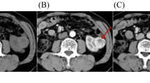 Examination was performed with renal plain and enhancement CT scan with a 64-row scanner (GE Discovery HD 750; GE Health Care, Chicago, IL, USA), with all patients fasting for 6 to 8 h before scanning. The scanning sequences and the related parameters were as follows: for cortical phase, medullary phase, and excretion phase, the duration of scanning was 30–35, 50–60, and 180 s after the injection of contrast agent, respectively. Iodophor alcohol (Jiangsu Hengrui Medicine Co., Ltd., Nanjing, China), a non-ionic iodine contrast agent, was injected through the elbow vein at a rate of 3.0–3.5 ml/s and the total injection amount was 0.90–1.01 ml/kg according to the patient’s body weight. Layer thickness was 5 mm, pitch 0.984:1, scanning field 36 cm × 43 cm, matrix 512 × 512, tube voltage 100–120 kV, tube current 134–409 mA, window width 250 ~ 450 HU, and window level 30 -50 HU.