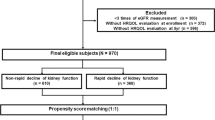 S-Cre levels were measured using the Jaffe rate method (kinetic alkaline picrate) at CMUH Central Laboratory by using a Beckman UniCel DxC 800 immunoassay system (Beckman Coulter Inc., Brea, CA, USA). The eGFR was calculated using the Chronic Kidney Disease Epidemiology Collaboration creatinine equation20. The S-Cre level at enrollment was used to define the baseline eGFR and the corresponding CKD stages according to the following cutoff values: > 90 [stage 1], 60–89.9 [stage 2], 45–59.9 [stage 3a], 30–44.9 [stage 3b], 15–29.9 [stage 4], and < 15 [stage 5] mL/min/1.73 m2. All S-Cre measurements of the enrolled participants were considered until the study endpoints. The quarterly average eGFR level was calculated if the patient had received more than one eGFR measurement in a 3-month period, and the individual’s eGFR trajectory was modeled based on quarterly average eGFR measures. For patient with only urine albumin-to-creatinine ratio (uACR) available, we converted uACR into uPCR based on the following equation derived from a Japanese study: \(\ln \left( {{\text{ACR}}} \right) = 1.32*\ln \left( {{\text{PCR}}} \right) - 2.64\)21. Proteinuria was defined as uPCR > 0.5 g/g creatinine. Details of other co-variables are summarized in the Supplementary Material.