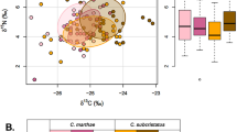 Stable isotope analysis offers a convenient approach to address these issues. Study of diet through stable isotope analysis lacks the taxonomic resolution of stomach content and scat analyses, but stable isotope ratios in animal tissues integrate dietary information through variable time spans, depending on the tissue turnover rate25. This alleviates the extremely short time resolution of stomach and scat contents, which often reveal the composition of just the last few meals. The stable isotopes of carbon (C) and nitrogen (N) are particularly convenient because they allow the calculation of simple metrics that encapsulate key information about the ecological niche of predators26,27,28. Thus, the C stable isotope ratio is informative about the primary source of carbon and decreases consistently along an onshore-offshore gradient in aquatic ecosystems29, and the N stable isotope ratio increases consistently along the food web providing a convenient and simple method to assess the trophic position of species30.