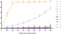 Antibacterial assays were realized to the method previously reported22,25. S. aureus strains were pre-cultured for 20 h in aerobic conditions at 37 °C in Mueller–Hinton Broth (MHB) medium (Becton–Dickinson Microbiology Company, Sparks, USA) (pH 7.4). Bacteria were suspended at absorbance of 0.001 at 620 nm in the MHB medium. Antibacterial activity was tested for 24 h incubation at 37 °C with shaking by measuring the inhibition of bacterial growth. Ten µl of final volumes (10–200 µg/mL) of synthetic peptides were incubated in microtitration plates with 90 µl of a mid-logarithmic phase culture of bacteria, with a starting absorbance of 0.001 at 620 nm. A mixture of Tetracycline (10 mg/L) and Cefotaxime (0.1 mg/L) were used as positive controls. Microbial growth was assessed by the increase of absorbance after 24 h incubation at 37 °C. The A620 nm value of control cultures growing in the absence of peptide and antibiotics was defined as 100% growth. A620 nm value with the antibiotics (Tetracycline and Cefotaxime) was taken as 100% inhibition. Absence of bacterial growth was verified by agar plate spreading. Each assay was performed in triplicates. Data were shown as mean + /− standard deviation of three independent experiments; p < 0.05.