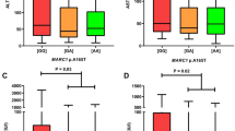 Serum liver biochemistries were obtained as part of routine clinical care at the time of the research MRI. For each patient liver biochemistry data (namely alanine aminotransferase (ALT, IU/L), aspartate transaminase (AST, IU/L), gamma-glutamyl transferase (GGT, IU/L), total bilirubin (mg/dL), immunoglobulin G (IgG, g/L), and gamma globulins (%)) were recorded alongside demographic data and the time between diagnosis and MRI imaging (disease duration) (Table 1). Percutaneous liver biopsy samples were assessed histopathologically for Ishak fibrosis (scale 0–6) as well as lobular and portal inflammation (scale 0–2) by two experienced liver pathologists.