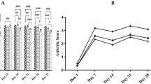 On the last day of study (day 60), rats were anesthetized with ether and retro-orbital plexus was used to withdraw blood. After blood withdrawal, rats were sacrificed by cervical dislocation. Immediately synovial tissues were isolated and stored at − 70 °C. Levels of ESR (Erythrocyte Sedimentation Rate), CRP (C-reactive protein), WBC (White blood cell), Hb (hemoglobin), RBC (Red blood cell), and PLT (platelets) were estimated in blood20, whereas turbidity, albumin, AST (aspartate transaminase), ALP (alkaline phosphatase), ALT (alanine transaminase), and TC (total cholesterol) were measured in serum using reagent kits (Accurex Biomedical Pvt. Ltd., Mumbai, India)23.