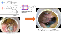 Several reports have analyzed the efficacy of protecting wounds after ESD8,9,10. Wound suturing with endoclips is frequently used as a first-line treatment. However, ESD-induced ulcers tend to be large (> 20 mm). Previous reports have indicated that complete closure with a suturing technique is difficult to achieve in larger ulcers11,12. Hence, wound-shielding techniques have attracted considerable attention. Endoscopic shielding with polyglycolic acid sheets and fibrin glue has been reported to be effective in preventing perforation and bleeding13,14,15. This method is advantageous because it has already been used in many medical fields16,17. However, it is technically difficult to accurately attach a sheet-like material to the bottom of the ulcer using an endoscope; therefore, generalized use of this method is difficult.