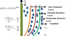 To control the entropy in the flow of heat is one of the main concerns of the industrial sectors. Since the problem had a large amplitude so a lot of researchers pay attention to solve it. They use different methods for different fluids to enhance the thermal conductivity23. Bejan et al. has came to the conclusion that viscous dissipation, heat transfer, mass transfer and chemical reaction are the main reasons are entropy enhancement in thermal systems24,25,26,27. To overcome the problem the first meaningful contribution was made by Choi, when he gave the idea of nanofluids28. This was the revolution in the flow of heat and has given the answers to the many unsolved problems. He just added nanosized particles of different type to solve the problem of entropy. Entropy in magnetohydrodynamics (MHD) by having exact analysis is investigated by Khan et al.29. A definition regarding the Bejan number which is useful to predict the power of magnetic field and entropy of fluid friction due to heat transfer is given by Awed30,31. Saouli and Aiboud-Saouli32 has used an inclined plate and liquid film to analyzed entropy generation. Mahmud et al.33 reported the experiment with added magnetic field influence. Selimefendigil et al.34 has explored entropy for natural convection flow of a nanofluid. 35,36,37,38,39 made a useful contribution in this regard. 40,41 has discussed that how can nanofluids be used in solar energy system and evaporation. Brownian motion and thermophoresis effect in heat transfer was analyzed by Buongiorno42. Some valuable studies have been done in this regards by Biglarian et al.43, Mosayebidorcheh et al.44, Pourmehran et al.45, Rahimi-Gorji et al.46, Tesfai et al.47, Wu and Zhao48, Khan49, Sheikholeslami and Bhatti50, and Abdelsalam and Bhatti51,52.
