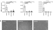 ECs were obtained from fresh PEA resected specimens. Colonies emerged after 7–20 days in culture and continued to proliferate to form a confluent monolayer (Fig. 2A). Efficiency of CTEPH-EC isolation was determined by endothelial colony appearance. CTEPH-EC had cobblestone morphology, typical of ECs (Fig. 2A). CTEPH-EC strongly expressed endothelial surface antigens comparable to HPAE (> 75% for all). This phenotype was maintained throughout cell culture. CTEPH-EC were negative for calponin and α-SMA (< 0.1%) (Fig. 2B,C). Cells also stained positive for endothelial nitric oxide synthase (eNOS) and with localized cytoplasmic granular organelles (Weibel-Palade bodies) (Fig. 2C). CTEPH-EC were confirmed to be ECs at mRNA and protein level (Fig. 3A,B). CTEPH-EC showed an increased expression level of VE-cadherin, CD31, ANG1, vWF, ICAM-1, CD44 and VCAM-1 expression levels compared to HPAE (Fig. 3A,B). No significant differences in membrane permeability were found between CTEPH-EC and HPAE (supplementary Fig. 2). CTEPH-EC showed significant reduction in eNOS expression compared to HPAE (Fig. 3A,B). The levels of VEGF-A and ANG2 were not significantly different between CTEPH-EC and HPAE (Fig. 3A). Additionally, whereas homeobox-(HOX)-containing genes HOXD3, HOXD8 and HOXD9 were highly expressed in HMVEC-L, they were virtually non-expressed in both macrovascular HPAE and CTEPH-EC (Fig. 3C).