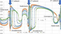 The angle-integrated spectra recorded from the GaAs/AlGaAs sample with photon energy of 7 eV and 21 eV are shown in Fig. 4c. In this case, the recorded photoemission intensity is vanishing close to the Fermi energy in both spectra. In this case, even the ELE-ARPES data recorded with \(\hslash \omega \cong \) 7 eV cannot detect the QW states, which are indeed buried much deeper below the sample surface than in the c-GaN/AlN sample (6 nm vs. 3 nm). On the other hand, the much better surface quality of the GaAs/AlGaAs sample allowed us to record very sharp ARPES spectra with 21 eV photon energy, as reported in Fig. 4a,b. At this photon energy the ARPES signal derives solely from the topmost GaAs layer. Indeed, in the 21 eV ARPES spectra it is possible to identify the dispersion of the GaAs valence band. We note that the integrated spectrum at 21 eV is similar to results from previous PES studies on the GaAs surface33.
