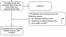 Since the maxillary anterior teeth accounted for more than 90% of the DI-affected teeth reported in the literature1,2,3,4,5,14,15, and full-mouth scans were not available in adequate numbers; patients with CBCT scans showing at least the entire maxillary anterior region were included in the study. Patients with CBCT images of poor quality or scans not showing the entire maxillary anterior region and those with incomplete records were excluded. Additionally, individual teeth with root fillings, post and/or crown, or any metallic material that obscured adequate visualization of the natural tooth morphology were excluded from the evaluation. Supernumerary teeth were included in this study. However, for any scan to be included, a minimum of three normal maxillary anterior teeth, including a minimum of one lateral incisor, had to be present and fulfill the inclusion criteria.