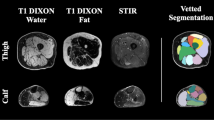 MRI imaging of the upper and lower leg was performed according to previously described MRI protocols35,64. In 12/12 controls and 14/28 FSHD participants, transversal T1 weighted, multi-echo T2 images and Turbo Inversion Recovery sequences (TIRM) of the upper and lower leg were acquired on a 3 Tesla MRI system (Tim TRIO, Siemens, Erlangen, Germany) (see Supplementary Table S1 for included participants). Participants were placed in the scanner feet first supine using a spine array coil and two phased-array coils placed around the legs. Scout images were acquired in three orthogonal directions for accurate positioning of the MRI slices, centered on a fish-oil marker which was placed on the skin at the 1/3 of the distance between patella and ASIS. Eight transversal slices (FOV 175 × 175 mm2, thickness 4 mm, gap 6 mm, base resolution 256) were acquired with a T2 multi spin echo sequence (TR: 3000 ms, 16 equally spaced echo times 7.7–123.2 ms). Next, 23 transversal slices (thickness 4 mm, gap 0.4 mm) were obtained with a T1 turbo spin echo sequence (FOV 250 × 244.5 mm2, TR/TE 600 ms/13 ms, base resolution 448), and with a TIRM sequence (FOV 175 × 175 mm2, TR/TE/TI 4100 ms/41 ms/220 ms, base resolution 256). The same imaging protocol was used for both the upper and lower leg.