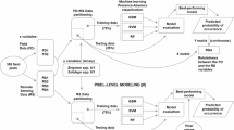 Although it resulted in the second highest map OA at stages 1 and 2 when comparing the seven alternative input feature spaces, the classification map presented here was produced using feature space F6 (Fig. 5A). Incorporating texture imagery (F7) improved map OA at both classification stages, however, it also lead to misclassifications at land cover transitions and at the edges of some physiognomies in areas where native vegetation is more highly fragmented (Fig. S9). As a result, the accuracies reported for F7 are likely to be artificially high, due to the placement of ground reference data within areas of homogenous vegetation, avoiding these transitional areas, and not reliably representing them in map accuracy metrics98.