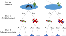 Site occupancy modelling requires repeat visits to the same sites to account for imperfect detection, ascertain the likelihood of observing a species if it is present (detection probability) and estimate the proportion of sites that are occupied (occupancy probability), with provisions to take into account covariates16,17,18,19. However, standard occupancy models assume that false positive observations do not occur. This assumption is not always met, particularly in cases where a species may be misidentified20 or in cases of indirect survey methods where the species is inferred to be present through biological products (e.g. tracks, faeces, hair). eDNA false positive error may not be negligible in surveys7 and—as with all methods—needs to be accounted for when assessing site occupancy. Surveys targeting eDNA may incur such imperfect detection at two levels—sample collection in the field and sample analysis in the laboratory. Recently, models have been developed that allow for multiscale occupancy models to be applied, which account for both positive and negative error21 at both stages.