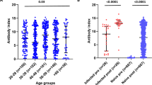 The overall seroconversion rates following a single dose of the vaccine was 88.7% (95% CI 85.2 to 92.1%). Seroconversion rates and the median antibody titres (given as the antibody index) are shown in Table 1. The seroconversion rates were significantly lower in older individuals (≥ 60 years of age) when compared to younger individuals (20–39 years of age) (Kruskal Wallis Chi Square = 11.137, p-value = 0.004). The antibody titres, as indicated by the antibody index, were significantly different in different age groups (p = 0.008, Fig. 1A) and significantly and inversely (Spearman’s r = −0.21, p = 0.0001) correlated with the age (Fig. 1B). The overall seroconversion rates for AZD1222 (93.2%)14 were significantly higher (p = 0.018) compared to Gam-COVID-Vac (88.7%). The seroconversion rates in the ≥ 60 age group (81.8%) were similar (p = 0.97) to levels seen following a single dose of AZD1222 at 4 weeks (81.6%)14.