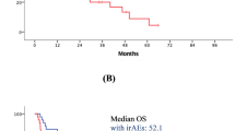 At a median follow up of 48.0 months, DFS was 100% at 24.0 months. PFS was 40.6% at 12 months, 34.4% at both 24.0 and 48.6 months (median reached at 5.8 months) (Fig. 1A). OS was 52.9% at 12 months. With 15 deaths, OS was 44.8% at both 24.0 and 48.6 months (median reached at 18.6 months) (Fig. 1B). We estimated PFS for patients who developed an irAE (40.0% at 24 months) and for who did not (31.8% at 24 months): the curves did not differ (p = 0.5442) (Fig. 2A). OS for the two groups did not differ (at 24 months 40.0% and 62.5% for patients without and with irAE, respectively; p = 0.4718), but median for who developed an irAE was not reached (Fig. 2B).