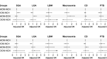 Searching prepregnancy BMI and maternal-infant adverse outcomes in PubMed, we selected three independent cohorts: normal Chinese women17, Japanese women18, and European and North American women14, for the comparison analysis. The adverse outcomes in each cohort were compared with women with GDM. The 95% CIs of the ORs for adverse outcomes were calculated based on a computational formula. Continuous data were compared using one-sample t-tests. The p < 0.05 was considered significantly different.