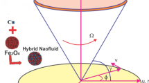 Magnetohydrodynamics is the study of flow dynamics under the interaction of magnetic fields. The term MHD was introduced by Alfeven et al.31. Magnetically influenced flows are valuable in numerous procedures and devices like MHD electricity generators, insulation of nuclear plants, crystallization, and so forth. Chamkha et al.32 demonstrated analytical and numerical methods for MHD flowing or thermal expansion in hybridized nanofluid via a porous stretching/shrinking layer with suction/injection and convective limiting conditions. Magnetized micropolar fluid flow past permeable cylinder was presented by Khader et al.33. Ijaz et al.34 reconnoitered magnetized hybrid nanofluid flow over stretchable spinning disks. Hayat et al.35 explored the magnetized movement of viscous fluid between two spinning disks. Ahmad et al.36 anticipated the flow of nanoliquid through a bi-directionally placed exponential stretching sheet under magnetic field influence. Usman et al.37 analyzed heat transfer aspects in the magnetized viscous liquid flowing over a non-linearly surface. Dogonchi et al.38 analyzed the impact of magnetically effected squeezing flow across parallel disks. Khader33 attained a solution of multi-walled nanotubes by implementing an analytical approach. Hosseinzadeh et al.39 probed anatomy aspects of hybridized nanofluid flow generated by spinning disks through a numerical scheme. Kashiie et al.40 analyzed the influence of different shape factors of (Cu-Al2O3) hybrid nanoparticles in water flow over the Riga surface by considering the aspects of radiative energy and EMHD. They incorporated three different shapes of hybrid nanoparticles (spherical, Birch, Blade) and found that nanoparticles concentration using blade shape is maximum while the spherical shape produces the lowest thermal rate. Recent studies on fluid flow problems under influence of magnetic fields are accessed through39,41,42,43,44,45,46,47,48.