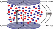 Table 2 discloses the influence of nanoparticles volume fraction volume \((\varphi )\), Reynold number \((R)\) and expansion ratio parameter \(({\upalpha })\) on skin friction and heat flux coefficient produced insertion of \((\text{TiO}_{2}{-}\text{Cu})\) hybridized nanoparticles in water at the surface of the lower disk. Four different shapes of induced nanoparticle spherical, plates, bricks, and cylindrical are considered and heat flux is also calculated. It is evaluated that by increasing \((\varphi )\) skin friction coefficient decreases whereas it mounts for increasing value of \(({\upalpha })\) and \((R)\). It is because by increasing all these mentioned physical parameters viscosity of fluid decreases and fluid particles move with the excessive speed within the disk so less friction is offered to the fluid by surfaces of disks. In addition, it is justified by the fact that nanoparticle volume fraction enhances the thermal conductance, and thus as outcome average kinetic energy raises which lift the motion of fluid and causes a reduction in wall drag forces. Regarding variation in heat flux coefficient, it is observed that an increase in of \(({\upalpha })\) and \((R)\) temperature gradient enhances whereas contrary behavior is depicted against \(({\upalpha })\). It is worthwhile to notice that the high magnitude of heat flux at the wall is computed by inserting platelets shape \(({\text{TiO}}_{2}{-}\text{Cu})\) hybridized particle. This is because Reynold number (R) is the ratio of inertial to viscous forces. So, by increasing (Re) influence of viscous forces decrements and kinetic motion of particles enhances. This boost in kinetic energy is the measure of the temperature so it enriches, and heat flux magnitude also raises. Table 3 illustrates the variation in skin friction and thermal flux coefficients at the lower wall by varying Reynold number \((R)\), and magnetic parameter (\(M)\) along with restricting expansion ratio (\(\alpha \)) greater than zero, It is manifested that with increment in magnetic parameter skin friction coefficient enhances and Nusselt number also uplifts. It is because of the reason that by increasing magnetic parameter (M) magnitude of Lorentz forces generated due to transversal appliance of the magnetic field to fluid flow which ceases the motion of particles and creates a reduction in kinetic energy. Due to this impact, the magnitude of shear forces applied by the surface i.e. measured by skin friction coefficient evidently enhances. Table 4 shows the accuracy of the applied computational scheme by finding values of missing conditions at different values of \(\eta \). From the attained data it is observed that convergence criteria meet for evaluation of results. Table 5 reveals the credibility of the present work by establishing a comparison with results published by Kashif et al.49. For the agreement of results currently computed problem is restricted by setting Reynold number \((R=0)\), Prandtl number \((Pr=0)\), Magnetic parameter \((M=0)\). Results are compared for skin friction and heat transfer coefficients by varying expansion ratio (\(\alpha \)) varying from expansion ratio (\(-5\le \alpha \le 5\)). An excellent match of results is found which shows the assurance and reliability of results. Variation in thermal conductivity of base fluid by taking into account the aspects of shape factor \((n)\) of induced nanoparticles is revealed in Fig. 2. Here, four different shapes of particles namely, spherical, plates, bricks, and cylindrical are obliged along with the assumption of consideration of the same magnitude of nanoparticle volume fractions i.e. \({\varphi }_{1}\) = \({\varphi }_{2}\) = \(\varphi \). It is noticed from the sketch that by increasing the shape factor of particles thermal conductivity enhances and optimized magnitude is attained at \(n = 5.7\) (platelets). It is also depicted that by increasing nanoparticle volume fraction ranging from \((0.01\le \varphi \le 0.1)\) elevation in thermal conductivity is manifested. Deviation in viscosity of base fluid (water) versus change in shape and size of inserted nanoparticles along with consideration of different magnitudes of particle volume fraction is portrayed in Fig. 3. Here, four different particles (spherical, bricks, cylindrical, platelets) are assigned by shape factor \((n)\) with magnitudes \((5.78, 7.889, 9, 12.7)\) respectively. It is checked that by elevating shape factor \((n)\) and particle volume fraction \((\varphi )\) viscosity of host liquid enhanced. In addition, it is worthwhile to mention that the maximum magnitude of viscosity is attained at \(n=12.7\) and \(\varphi \) = 0.1 i.e. (0.0009). Figure 4 represents the impression of volume fraction parameter on axially directed velocity by fixing \(\alpha =-4,R=-1,M=1,Sc=1,Pr=6.2.\) It is observed that the magnitude of the axial component of velocity near the lower wall decreases whereas contrary behavior is observed near the upper wall. The reason behind this fact is that we have prescribed a negative magnitude of velocity at the lower wall of the disk i.e. \(f\) = − 1 whereas the upper wall is prescribed with \(f\) = 1. In addition, the increasing impact of nanoparticle volume fraction \((\varphi )\) is because increasing the magnitude \((\varphi )\) means the addition of more hybrid nanoparticles in the base fluid. So, by increasing \((\varphi )\) thermal conductivity of fluid increases, and thus as an outcome velocity of the fluid in the axial direction upsurges. Similar behavior in momentum distribution along radial direction against nanoparticle volume fraction \((\varphi )\) is divulged in Fig. 5. It is salient to notice that by increasing \((\varphi )\) the amount of metallic and non-metallic nanoparticles increases in the base fluid and considering \((\varphi =0)\) means that only base fluid is remaining. So, the purpose of considering nanoparticles is to enhance the velocity which is achieved and proved graphica