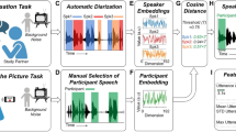 Once speaking roles (child vs. adult) were obtained for each participant, we computed latency as the duration (in seconds) of non-speech regions between speaker turns. We computed latency for the child and the examiner separately. As opposed to using the entire session to compute latency measures for the child and examiner, we restricted our computation to only times within a conversational topic. We defined a topic as a semantically coherent segment of conversation and estimated topic boundaries in an automated manner using the ASR outputs (text format). We segmented the ASR transcript for a BOSCC session into contiguous chunks (i.e., topics) using dynamic programming47 to optimize for the overall lexical coherence48 of the session that is computed as distance measures between word embedding representations. Combining this segmentation output with speaking times obtained from the speech processing pipeline, we obtained topic boundaries in the audio recording (see Fig. 2b). The topic boundaries allowed us to compute latency within each detected topic category, referred to as intra-topic latency. We were primarily interested in examining the time it takes for the child or examiner to respond when they are having back-and-forth exchanges within each conversational topic, since there is no clear expectation for social responses as one moves from one conversational topic to another.